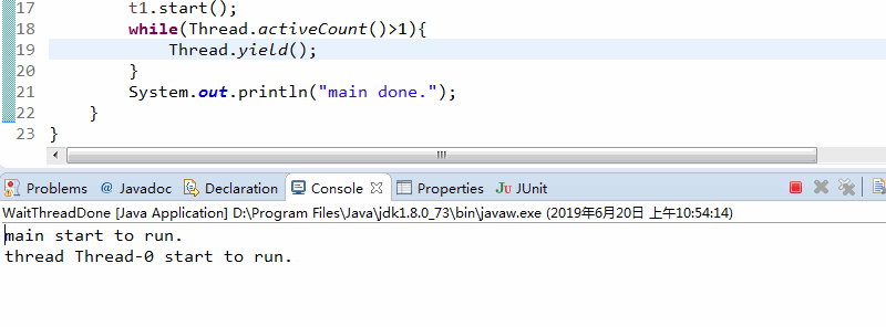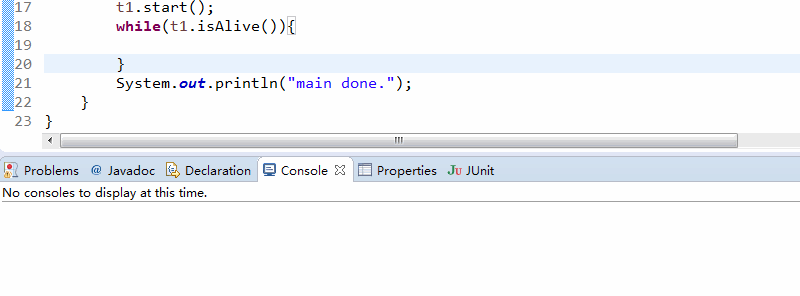 package com.xxx.async;public class WaitThreadDone { public static void main(String[] args) { Thread t1 = new Thread(new Runnable() { @Override public void run() { try { System.out.println("thread "+Thread.currentThread().getName()+" start to run."); Thread.sleep(2000); System.out.println("thread " + Thread.currentThread().getName() + " done."); } catch (Exception e) { e.printStackTrace(); } } }); System.out.println("main start to run."); t1.start(); System.out.println("main done."); }}