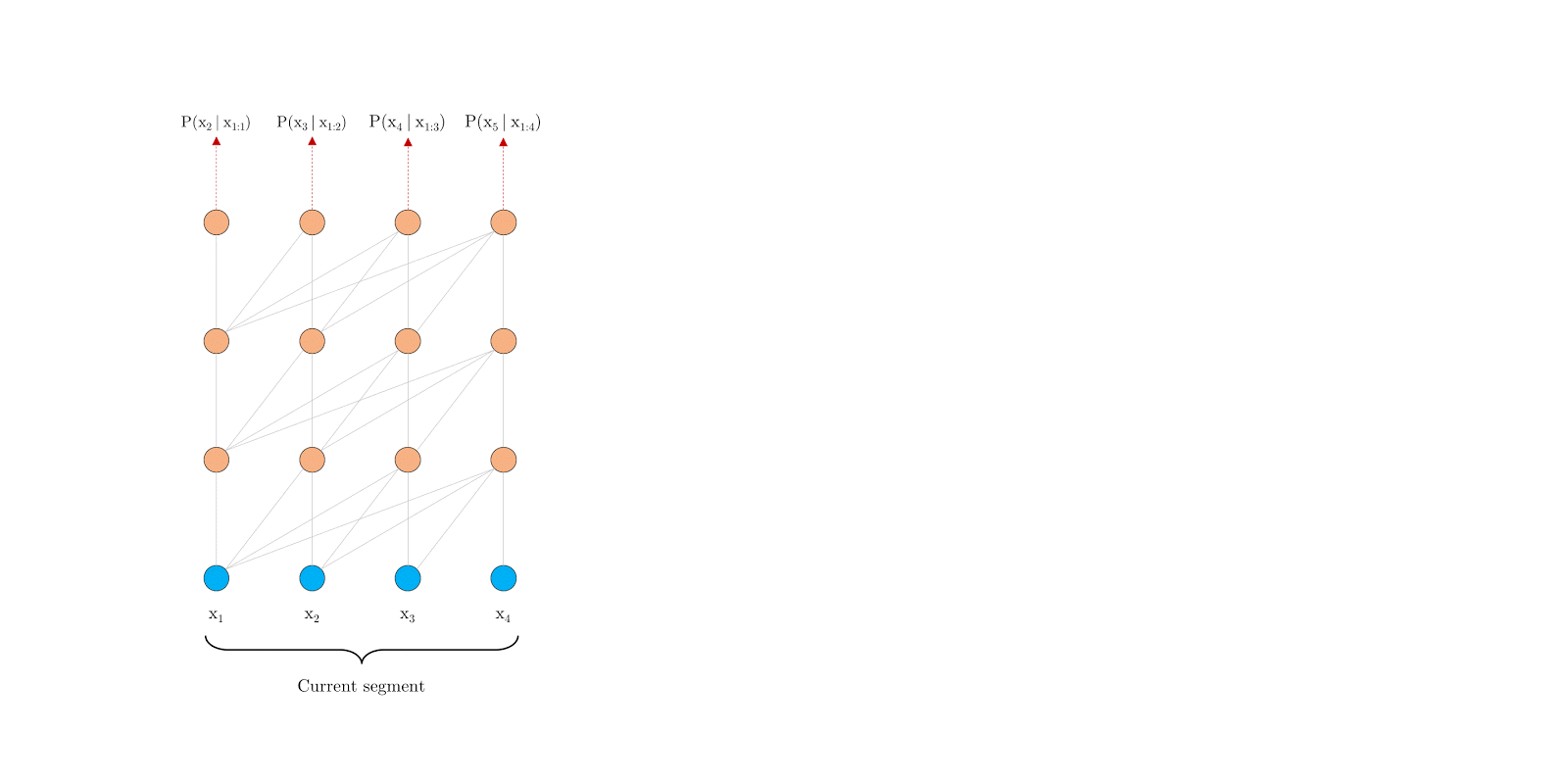 如果预测 x4 我们只要拿之前预测好的 [x1, x2, x3] 的结果拿过来,直接预测。同理在预测 x5 的时候,直接在 [x1,x2,x3,x4] 的基础上计算,不用像Vanilla Transformer一样每次预测一个字就要重新计算前面固定个数的词。